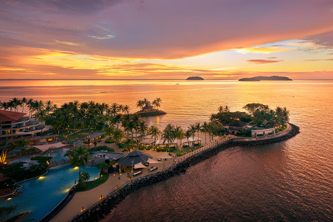 코타키나발루 국제공항은 시내와 매우 가까워 그랩(Grab)으로 15분 내 도착 가능합니다. 숙소는 샹그릴라 탄중 아루 리조트 추천! 인피니티 풀과 프라이빗 선셋 라운지가 매력입니다.